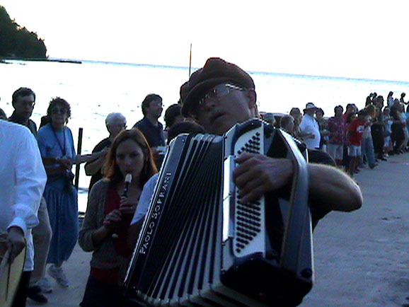 FISH BOIL DINNER (Sat Only 5:45pm to 7:45pm - in Sister Bay Waterfront Park) (back to top) Fish Boil Background: While fish boils are thought to have originated with Scandinavian settlers and lumberjacks who discovered a tasty way to enjoy the fruits of Lake Michigan, there is also a tradition of fish boil dinners in Scotland using salmon. Fish boils feature both great food and great showmanship. The ingredients are boiled in a kettle with about 30 gallons of water over an open fire. After cooking a while, spices are added and as the fish oils rise to the surface of the boiling cauldron, the cooking crew tosses a small can of kerosene on the fire. A great burst of flame shoots up and the intense heat causes the pot to boil over, spilling the unappetizing fish oils over the side, extinguishing the fire and leaving the ingredients perfectly done, steaming hot and ready to serve. The fish, potatoes and onions are served with coleslaw and topped off with Door County Cherry pie for dessert. Coffee, iced tea, lemonade are included. BYO Beer & Wine. There will be three seatings at 6:00pm, 6:30pm and 7:00pm for this fixed-price meal - $18.00, Kids Under 13: $12 - tax & tip included. Reservations required. Limit 35 per seating. Specify your seating time on the Registration Form. Following dinner, there will be the usual live music, singing and dancing in the park and on the Sister Bay Pier before sunset. To celebrate and honor the lives of Warren Kubitschek and Nancy Yugo, Saturday July 9, 2011, approximately 7:00pm during the Fish Boil Dinner with Music, Dancing & Singing in Sister Bay Waterfront Park Click Here for the Warren-Nancy Remembrance Page |